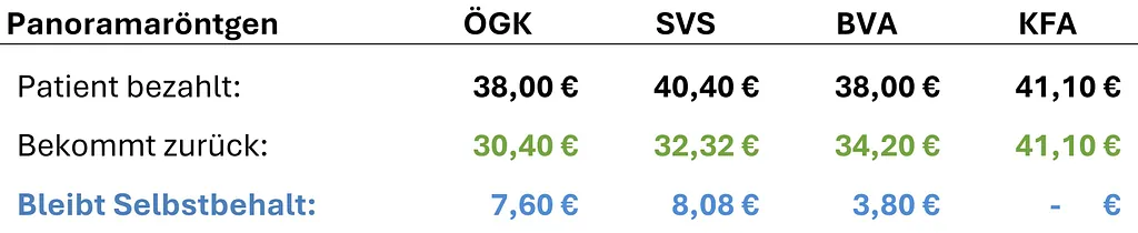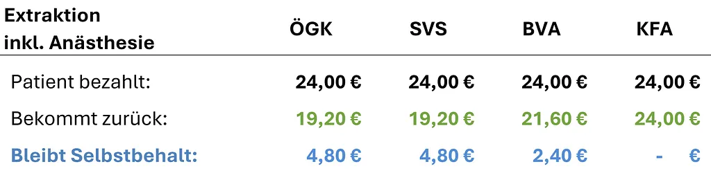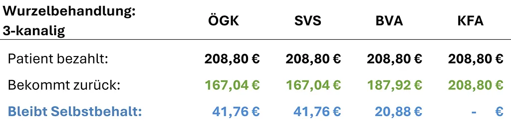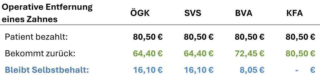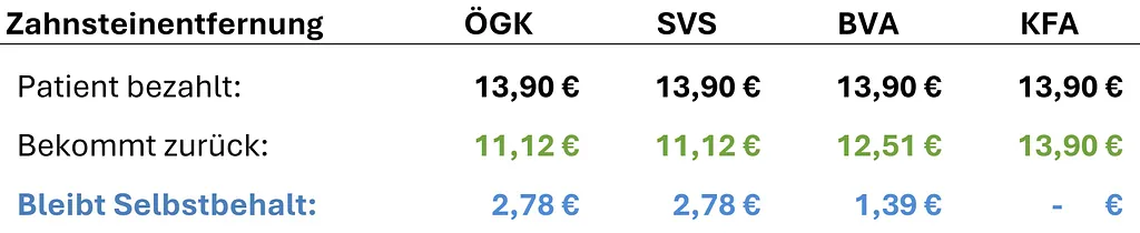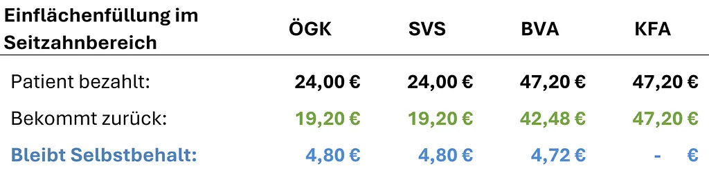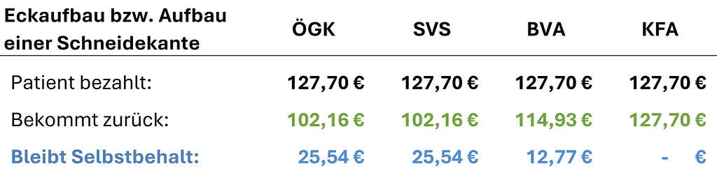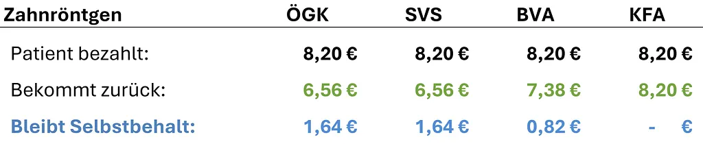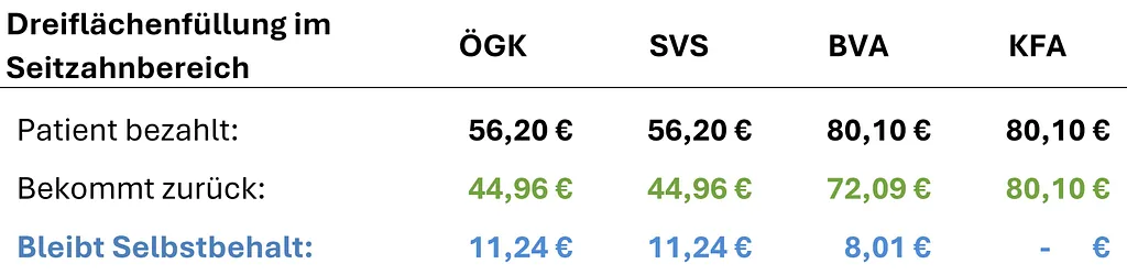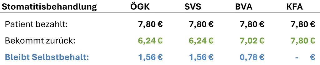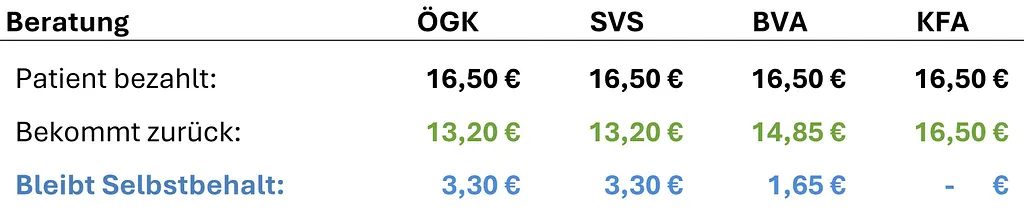 Im Folgenden finden Sie eine transparente Übersicht der Kassentarife, Refundierungen sowie Selbstbehalte typischer Behandlungen je Gesundheitskasse.